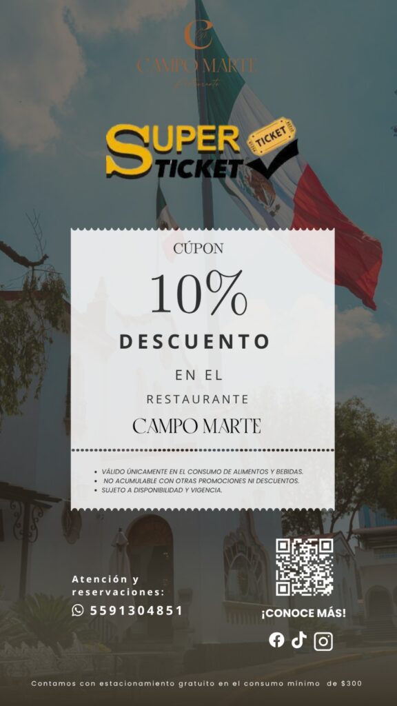 Disfruta de una experiencia culinaria excepcional en el Restaurante Campo Marte y obtén un 10% de descuento en tu consumo total de alimentos y bebidas. Este beneficio es válido únicamente para clientes Superticket y no es acumulable con otras promociones o descuentos. Sujeto a disponibilidad y vigencia del restaurante.